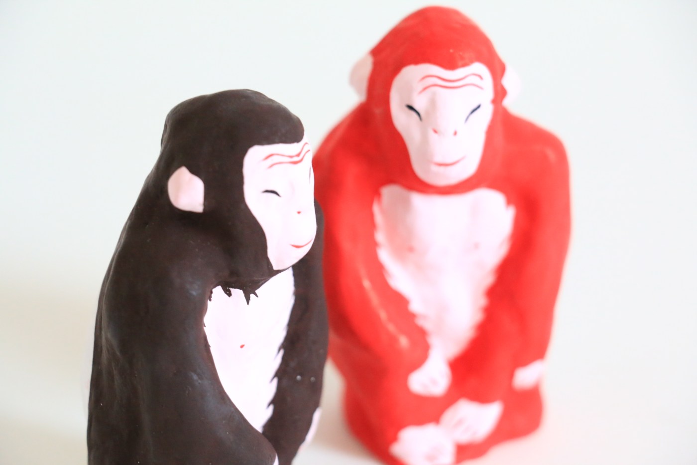 赤は魔除けの効果もあり、お守りのような身近な存在だった郷土玩具には、めずらしい色ではありませんが、おさるさんが赤色に塗られているのは初めて見ました。
