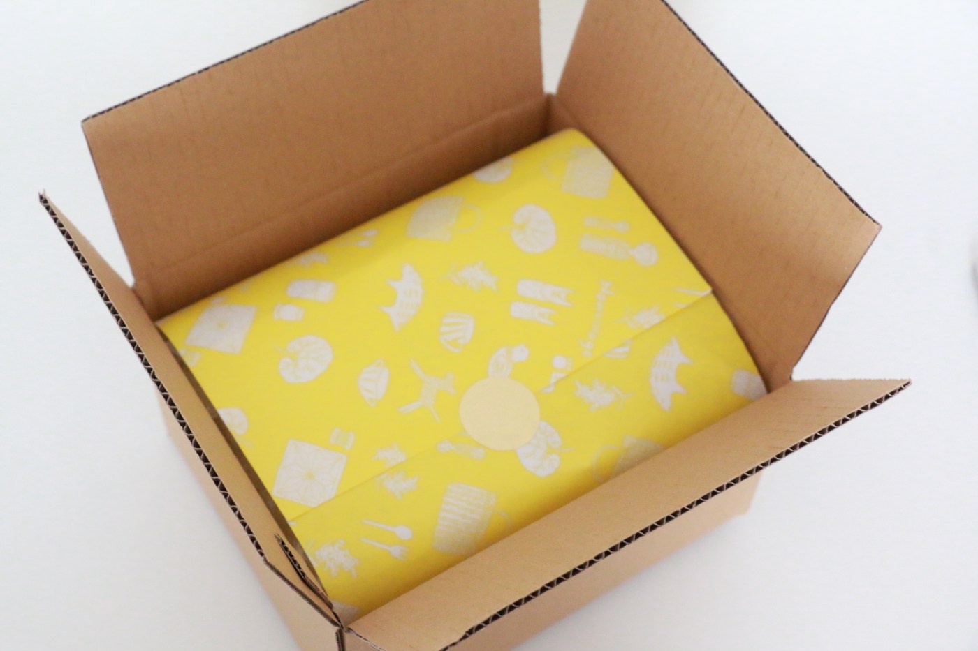 早速、オンラインショップでご購入いただいた方に、簡易包装させていただきました。ぐるっと包んで、シールをペタンと。