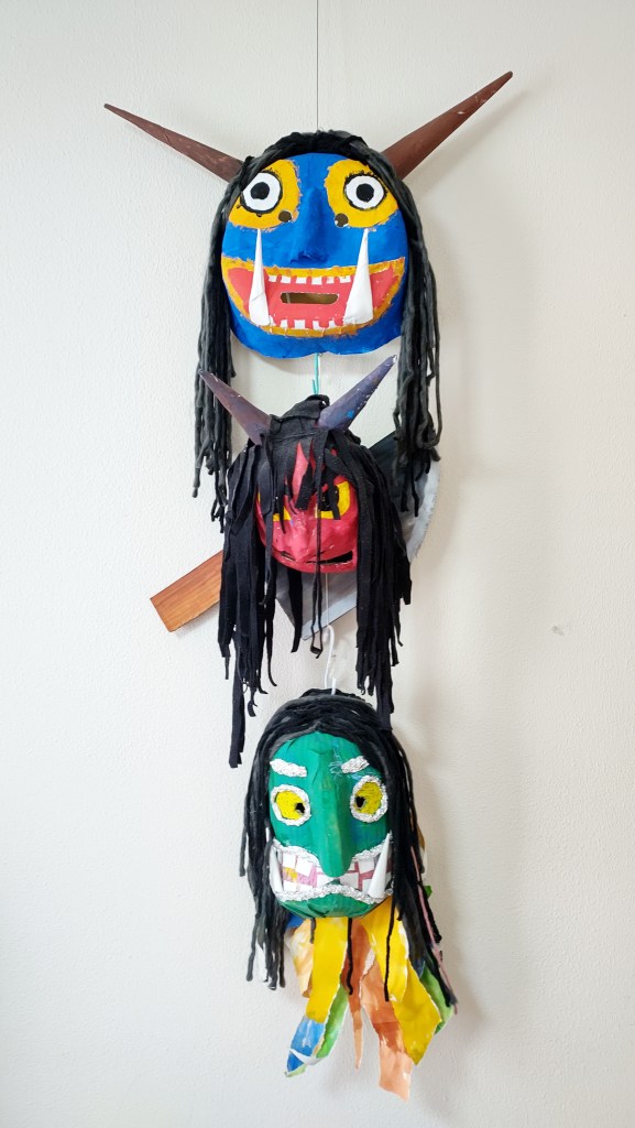 わが家の毎年恒例になったなまはげ作りも、今年で3年目。一番上に飾ってある青色のお面が年末に作ったものです(↑)。