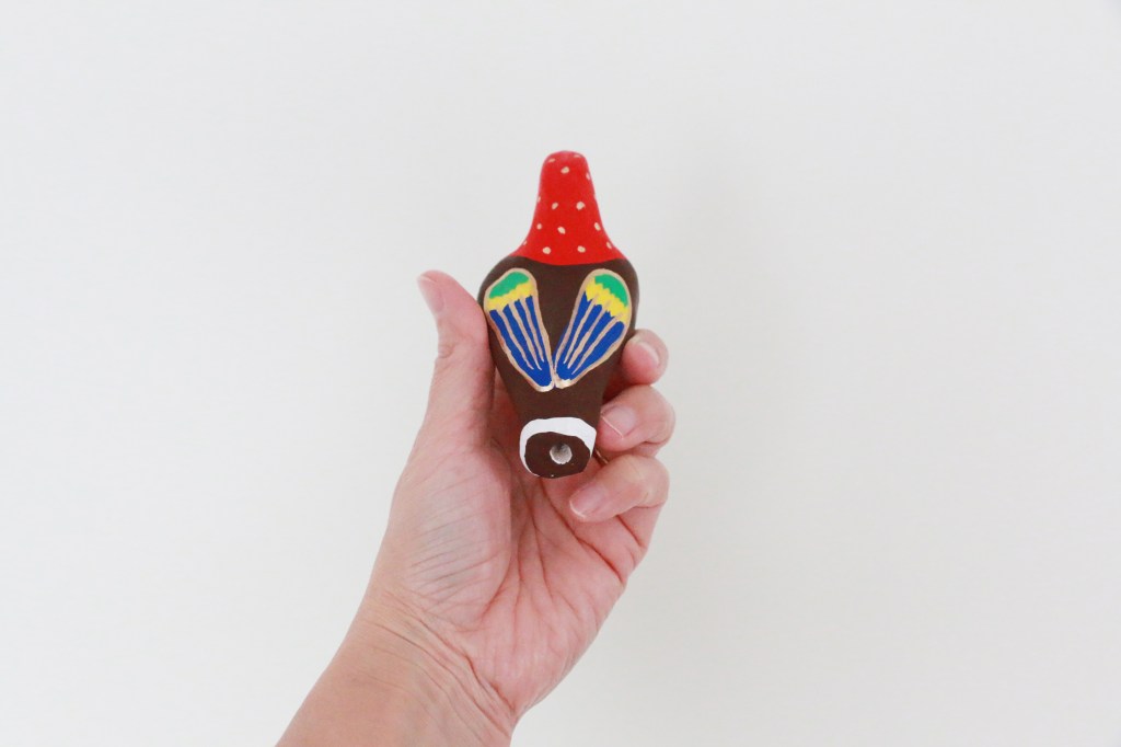 尾っぽのところに空気穴があり、ここから息を吹き込むと、ホー・ホーという音が鳴る仕組みです。土人形ならではの包み込むような優しい音が、耳に心地良く響きます。