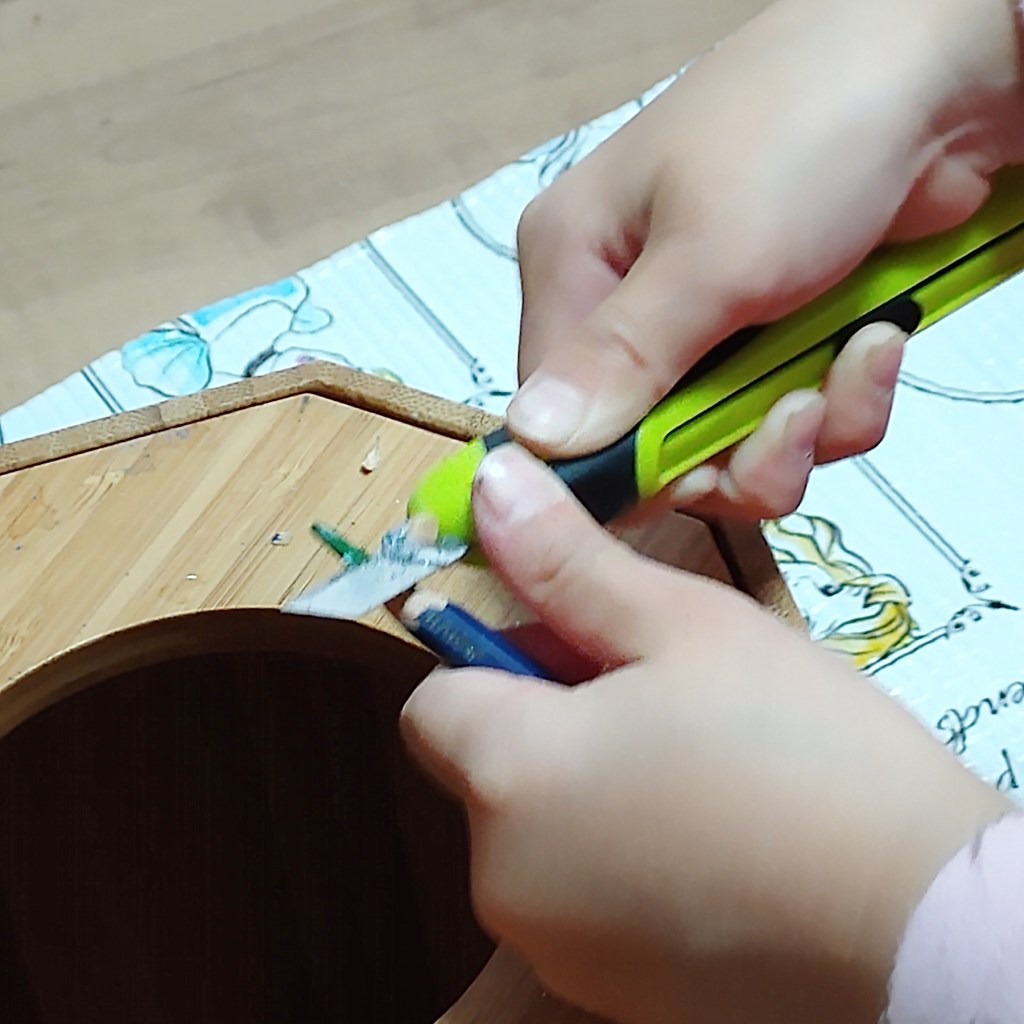 ▶ポイント 削り始めはゴミ箱に削りかすを入れることが難しく、結構な勢いで部屋中に飛び散るので、床にレジャーシートを敷いて始めるのが良いです。