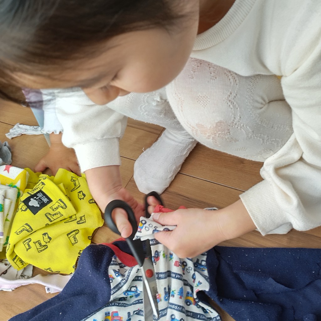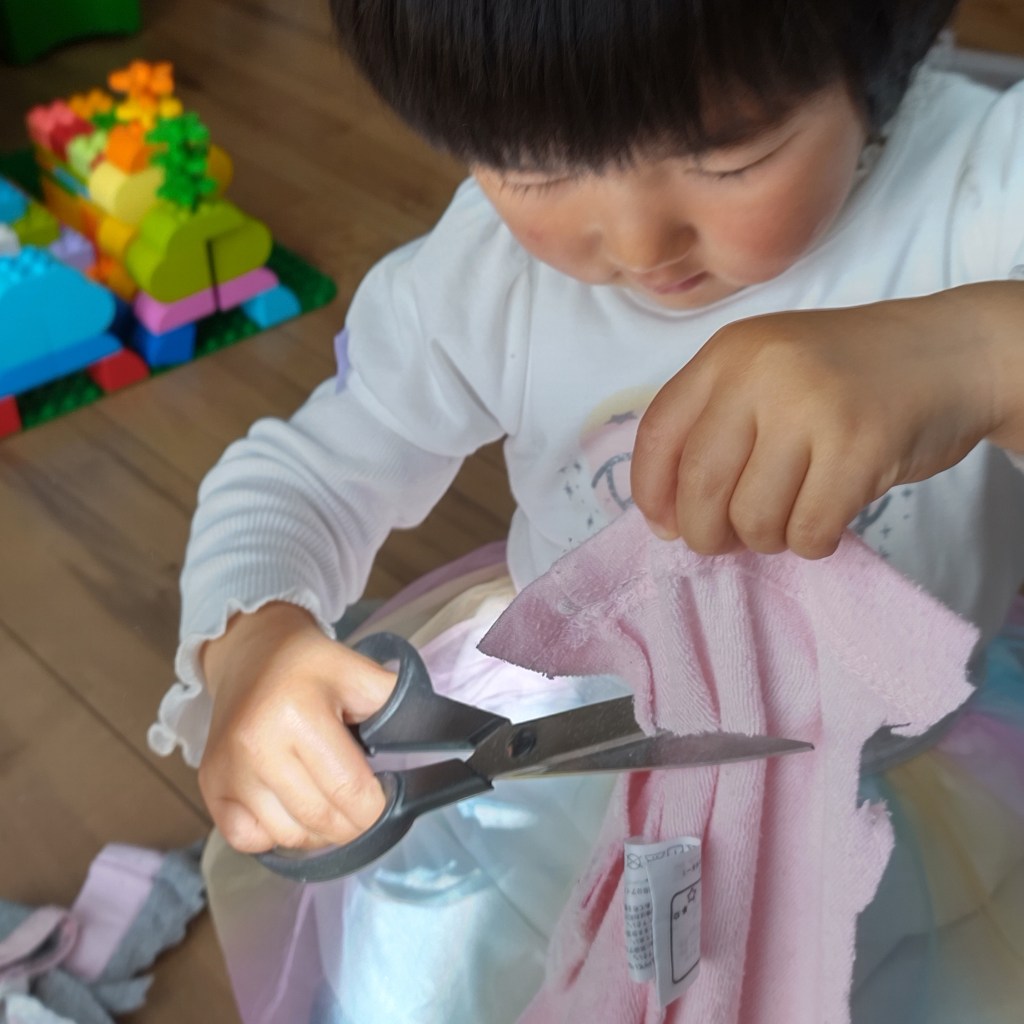 ▶注意:2歳児には「これはもう着れなくなってしまった服だから、特別に切ってもいい」と事前に説明しました。
