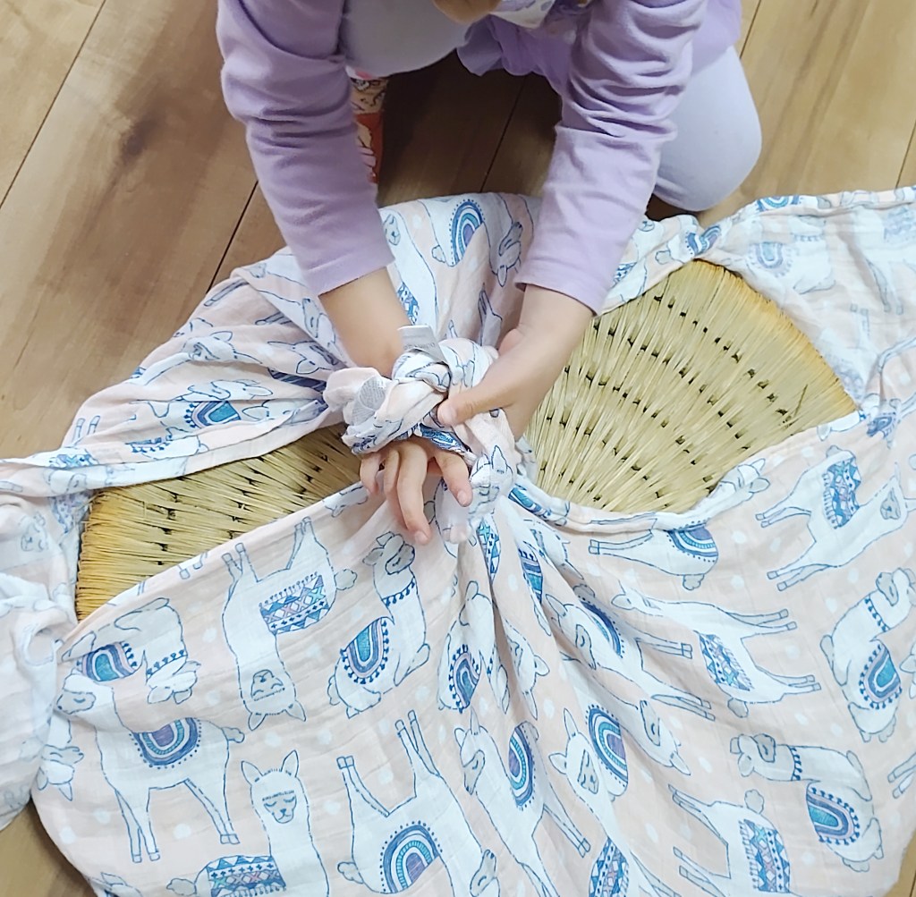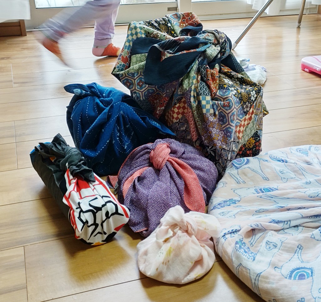 家にある風呂敷では足りず、赤ちゃん用のブランケットも引っ張り出してきて座布団を包んだり、家中モノがひっくりかえって、しっちゃかめっちゃかになりましたが、形に応じた包み方もそれとなく体験できた…ような気がします。