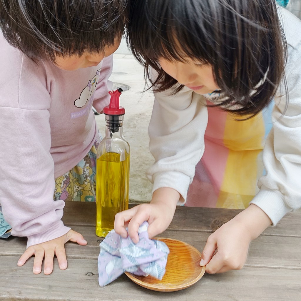 仕上げは、普段使いのオリーブオイルを布で塗ったら「もとに戻ったー!」と大喜び。小さな達成感が味わえたようです。