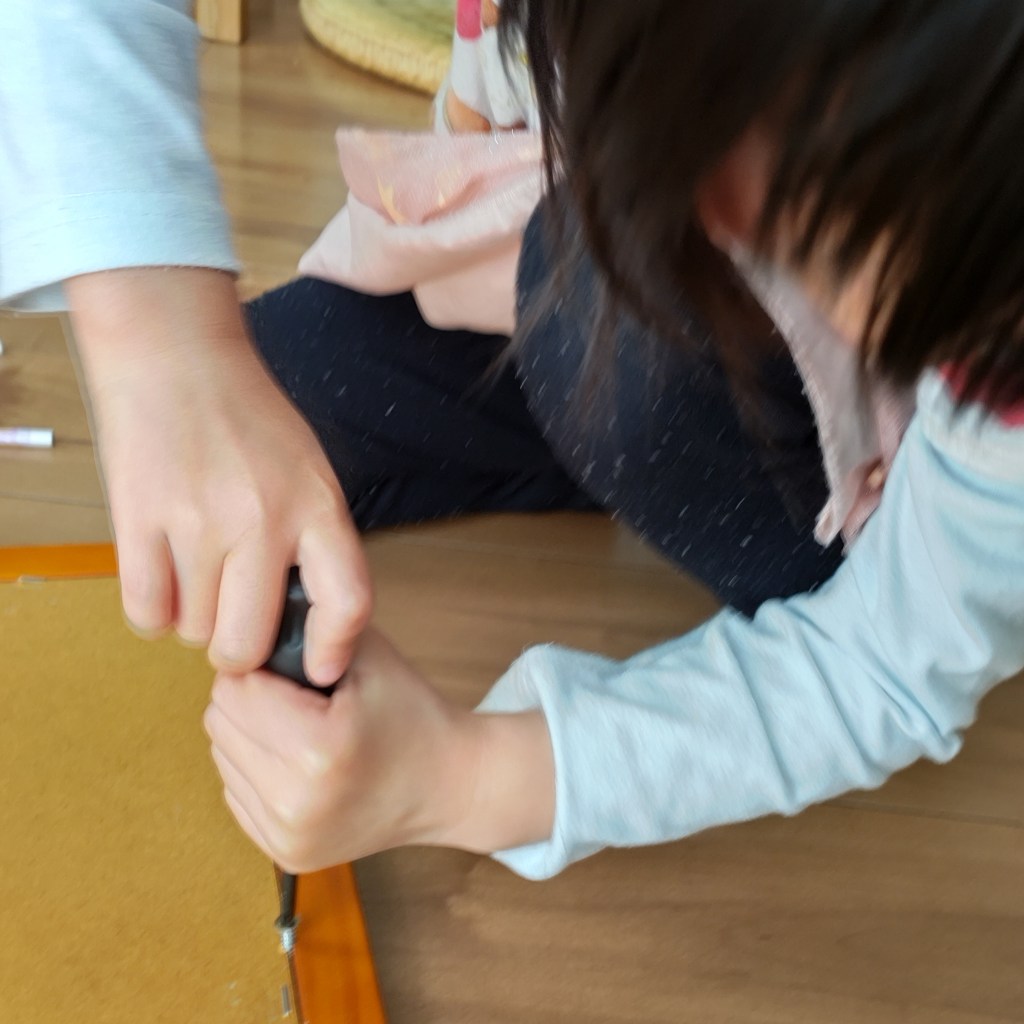 くるくる回りながらネジが入っていく様子と、木片とネジ山がピタッと合う最後の感覚が気持ちよかったようです。そう言えば、こんな子どものオモチャもありましたよね。興味の対象が意外で、とても驚きました。