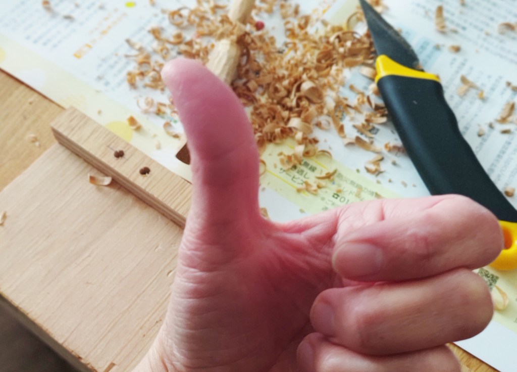 小一時間くらいこの作業を続けると、小刀をぐいぐい押している左手の親指が、真っ赤になります…(;’∀’)。