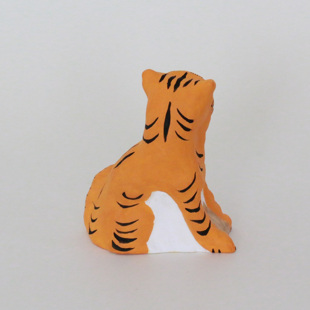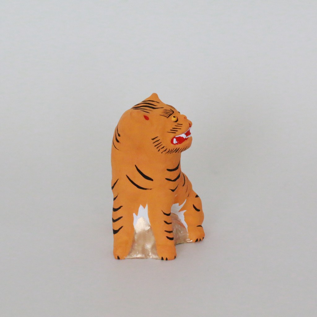 焼き上がって下地を塗っているもの、絵付け中のもの、乾燥中のもの、できあがって梱包を待っているもの(上の写真)など、工房中が寅であふれかえっていて、サファリパークに来たような?気持ちになりました。