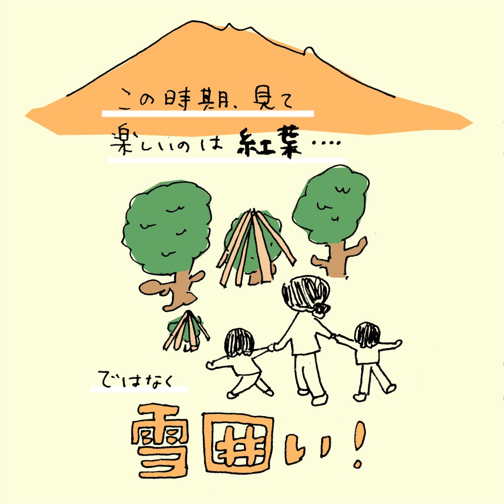 雪が積もり始めると雪囲いも隠れてしまうので、じっくり見るなら今がチャンス!とばかりに、子どもたちとお散歩しながら、車を運転しながら、いろんな雪囲いを見て楽しんでいます。