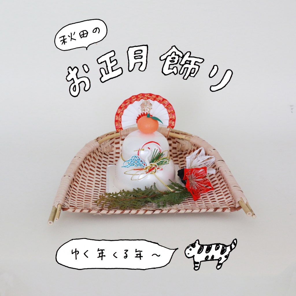 秋田では、箕(み)にお餅をのせてお正月に飾る風習があり、ご家庭によっては一緒に松や白紙、昆布や花などを添えることもあるとか。