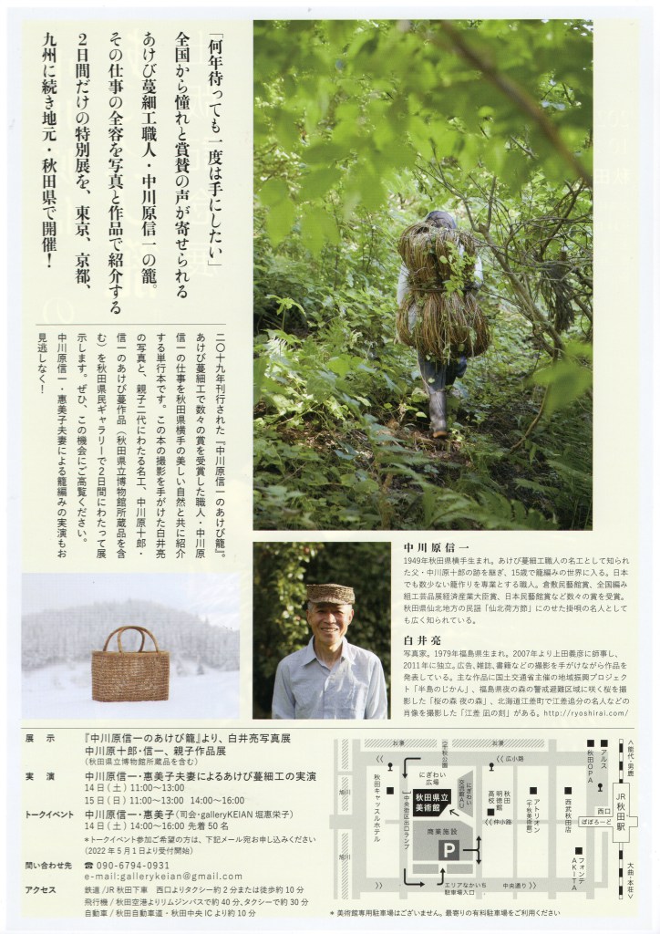 中川原十郎・信一さんが制作されたあけび籠の展示や白井さんの写真が展示され、会期中は中川原信一・惠美子夫人によるあけび蔓細工の実演もあります。