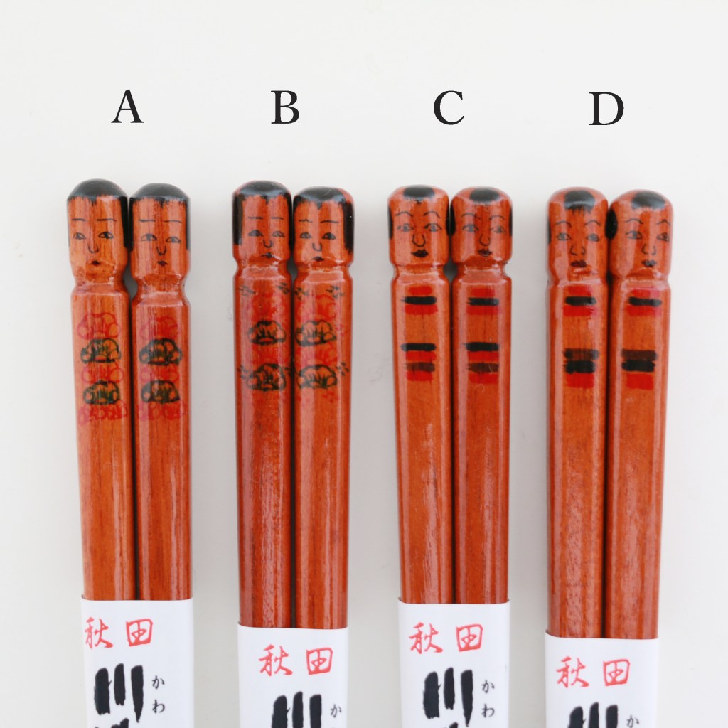 ほのぼのとした素朴なお顔が可愛いお箸で、川連漆器とこけしを取り扱う阿部始こけし店が制作したオリジナル商品で、こけしの部分は工人の三春文雄さんが絵付けしています。