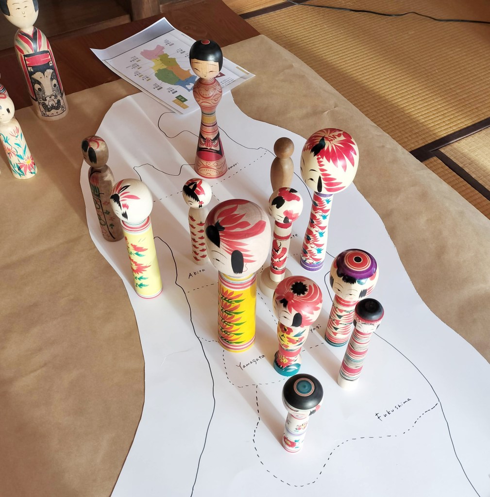 まず最初に、高橋さんが持ってきてくれた東北のこけしを系統(産地)ごとに並べて、立体こけしマップのようなものを作りました。