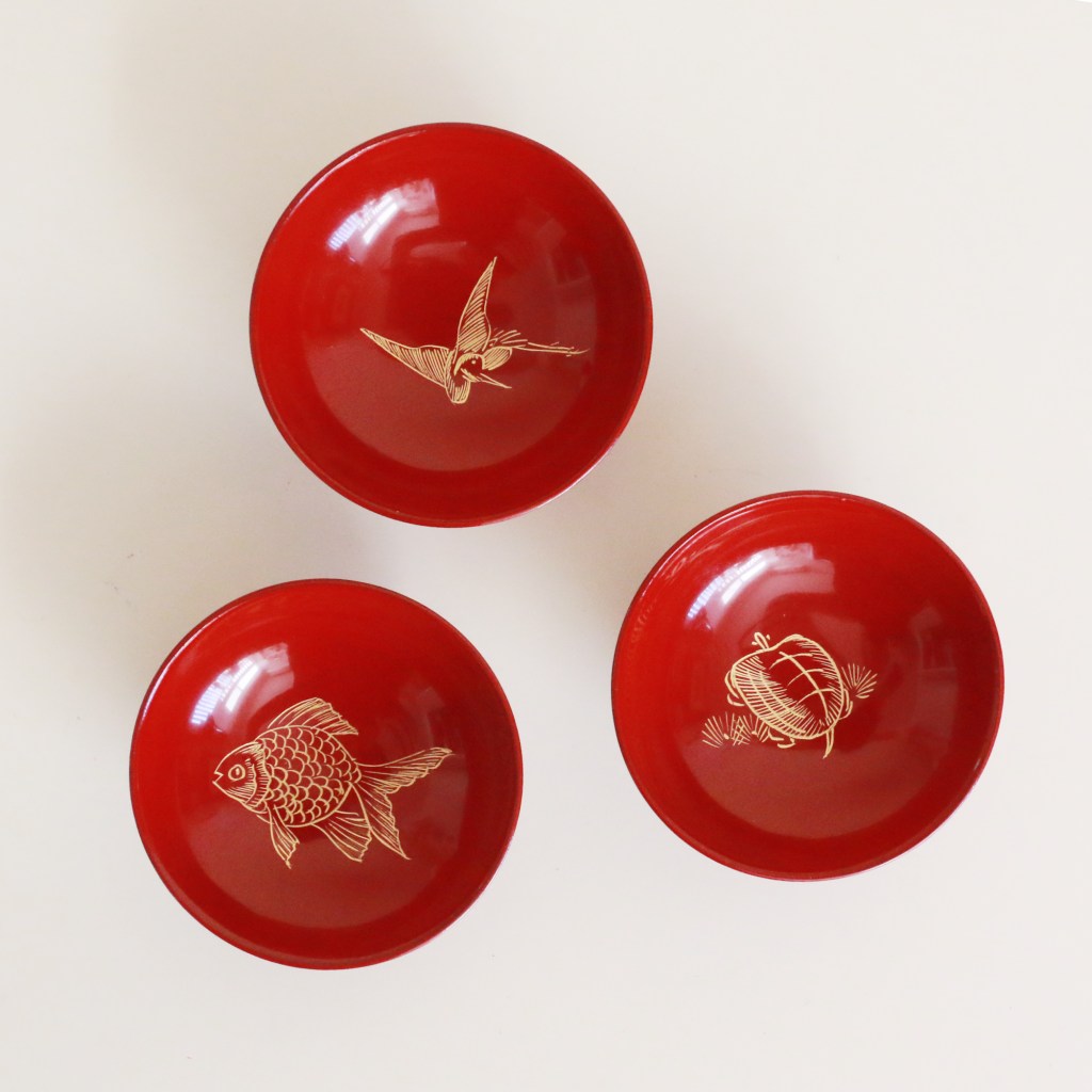 また今回は、川連漆器の祝い盃もご紹介しています。沈金が施されたデザインは、鶴、亀、金魚の三種類。
