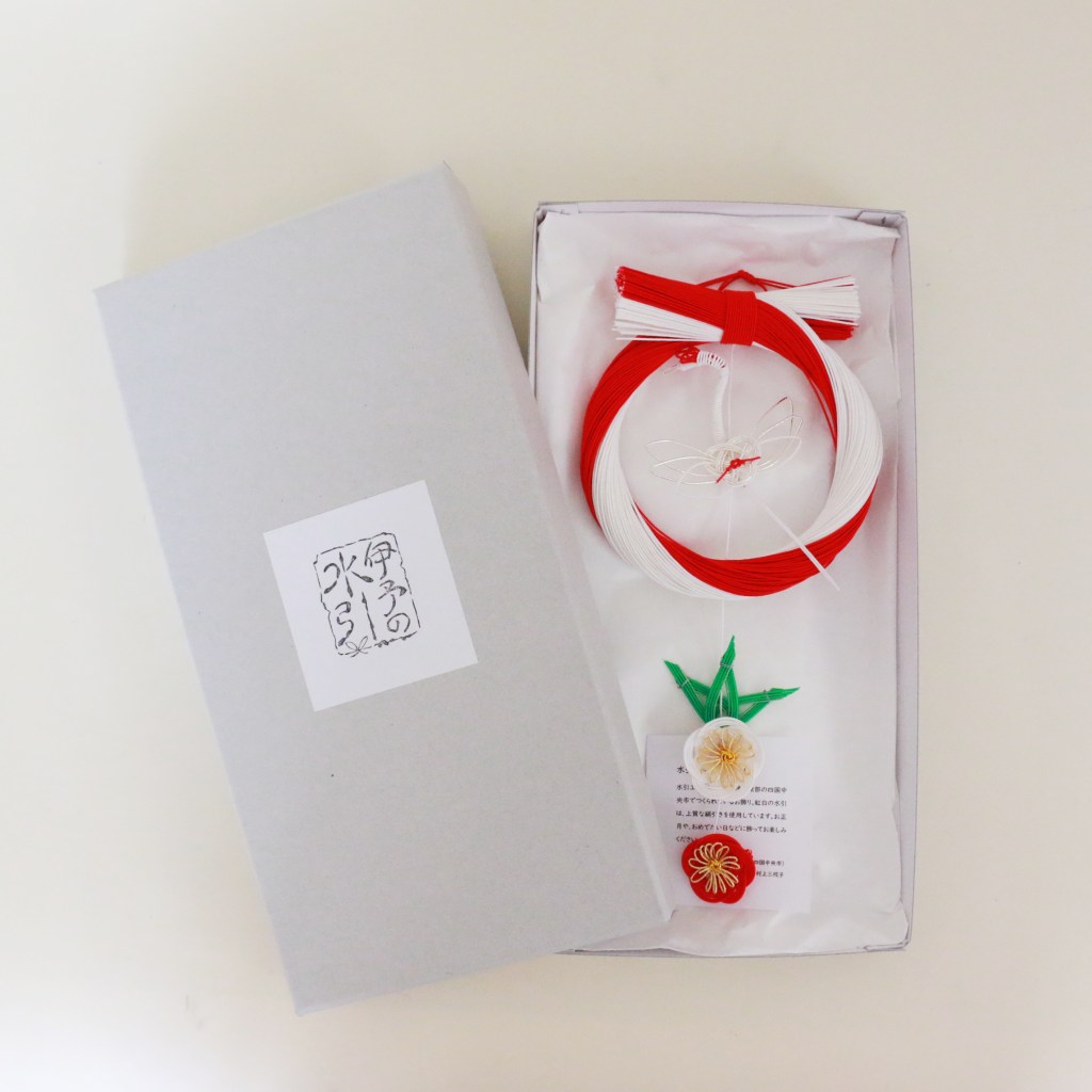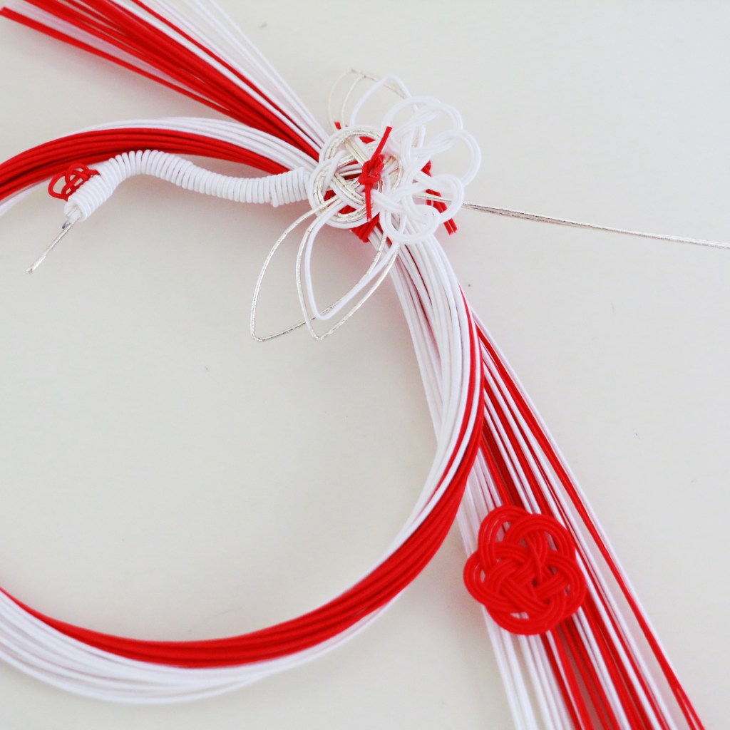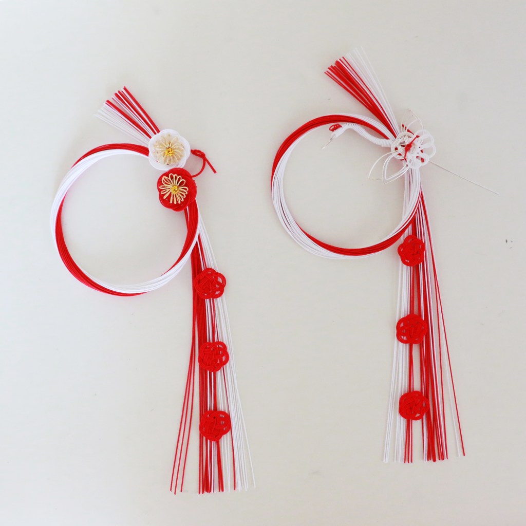 こちらは「ななめ飾り」。輪の結び目に、鶴か紅白梅が付いています。シンプルなかたちですが、飽きずに毎年使えてお正月を華やかに彩ってくれるデザインです。