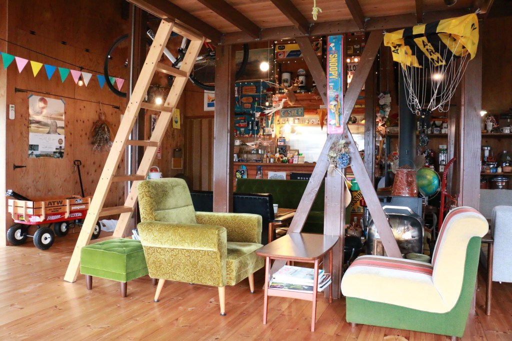 店内は、アウトドア好きの店主が揃えたアウトドア用品や道具などが賑やかに飾られているので、まるで秘密基地に来たようなワクワク感でいっぱい。