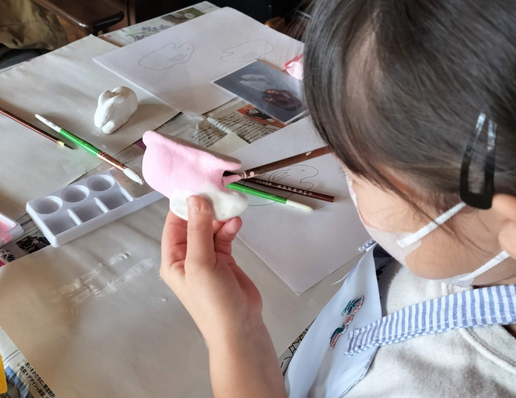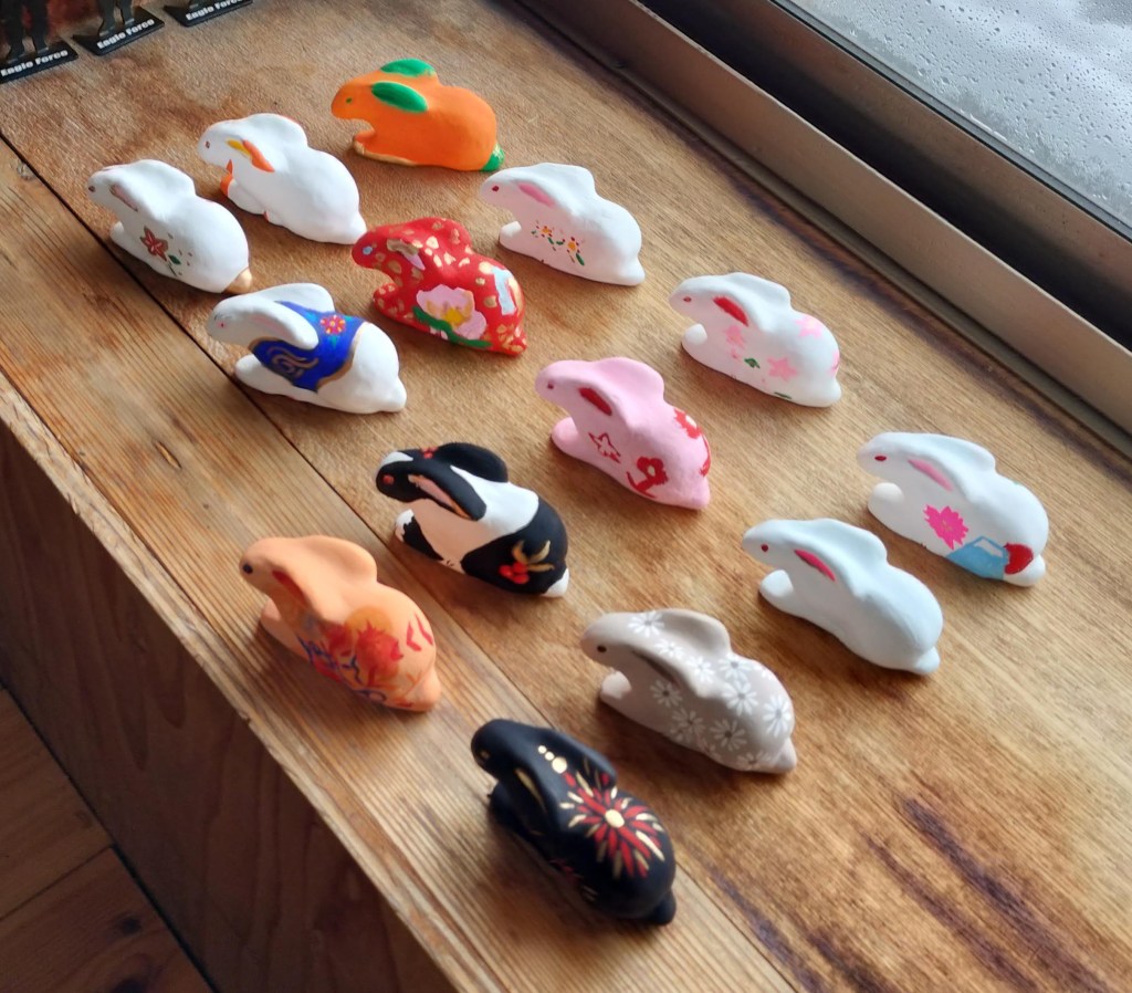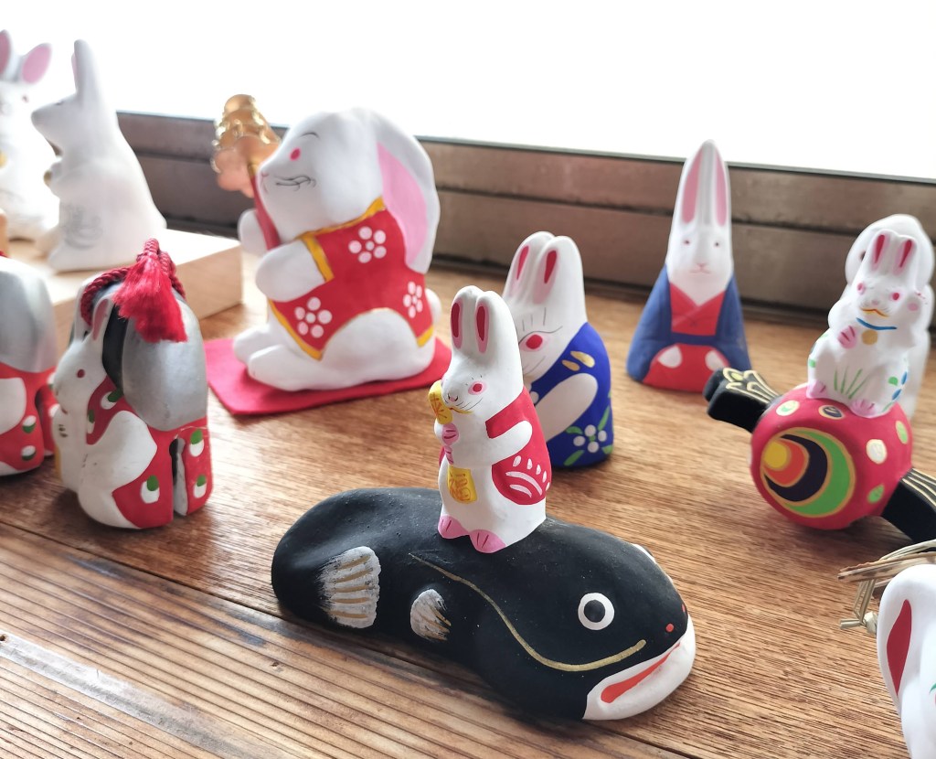 各地のうさぎを見比べながら、造形や絵付けによって雰囲気がこんなに変わるんだ !? とか、このうさぎはどうしてこんなに可愛いんだろう? あ、目がこう描かれてる…! など、違いや特徴をじっくり観賞しながら、絵付けのコツを学んでいきます。