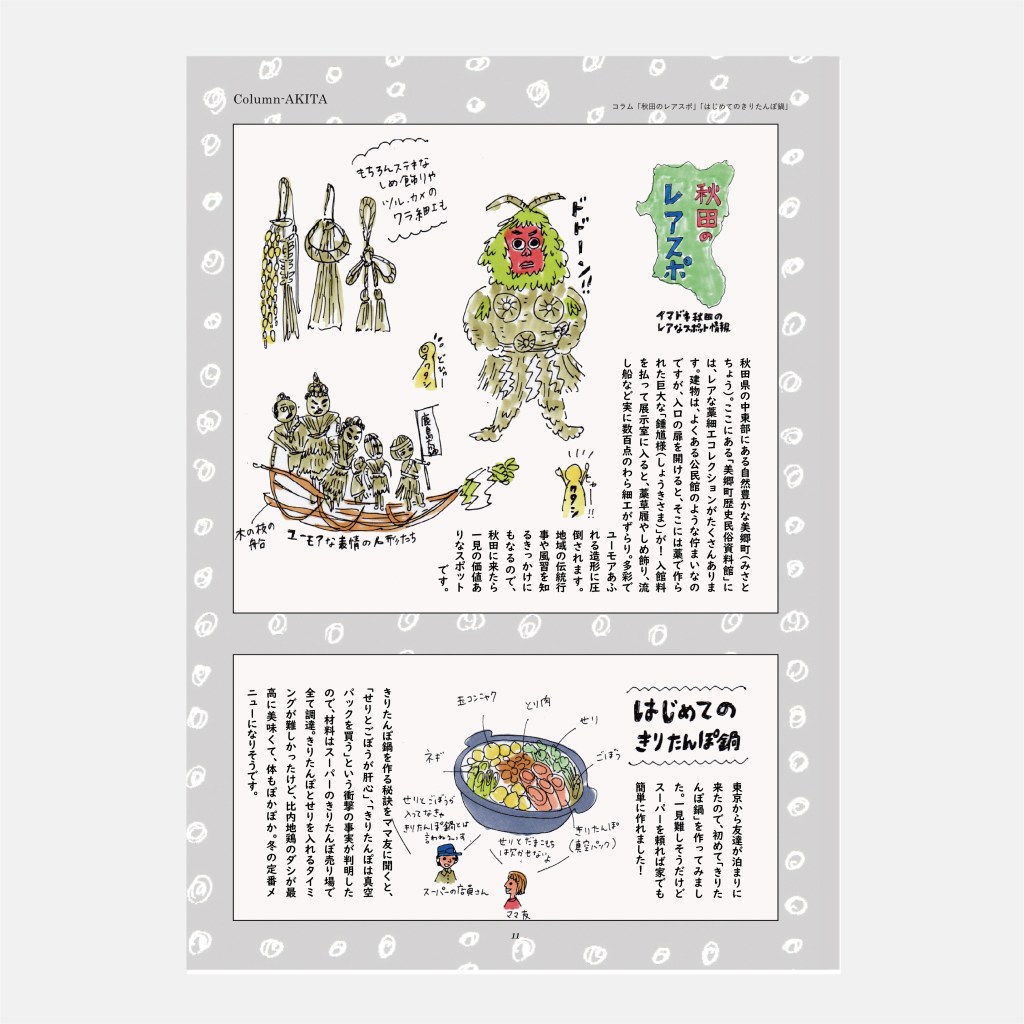 それぞれの章の合間には、秋田暮らしにまつわるコラムやイラスト、日記にような編集後記を載せています。