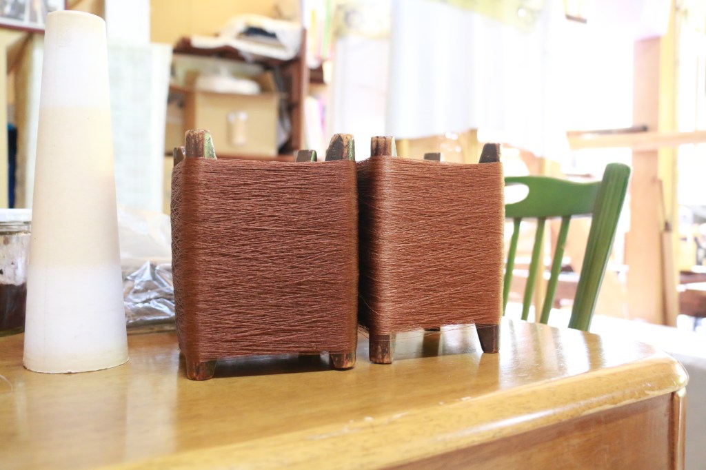 秋田八丈の特徴は、秋田市で採れるはまなすの根で染色しているところ。鳶色(とびいろ)と呼ばれる深い茶色に染め上げます。