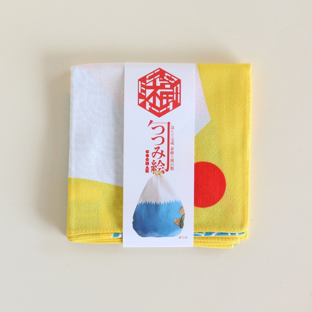 開くとこのくらいのサイズ感で、日本伝統の縁起物、富士山と鶴亀がポップにデザインされています。