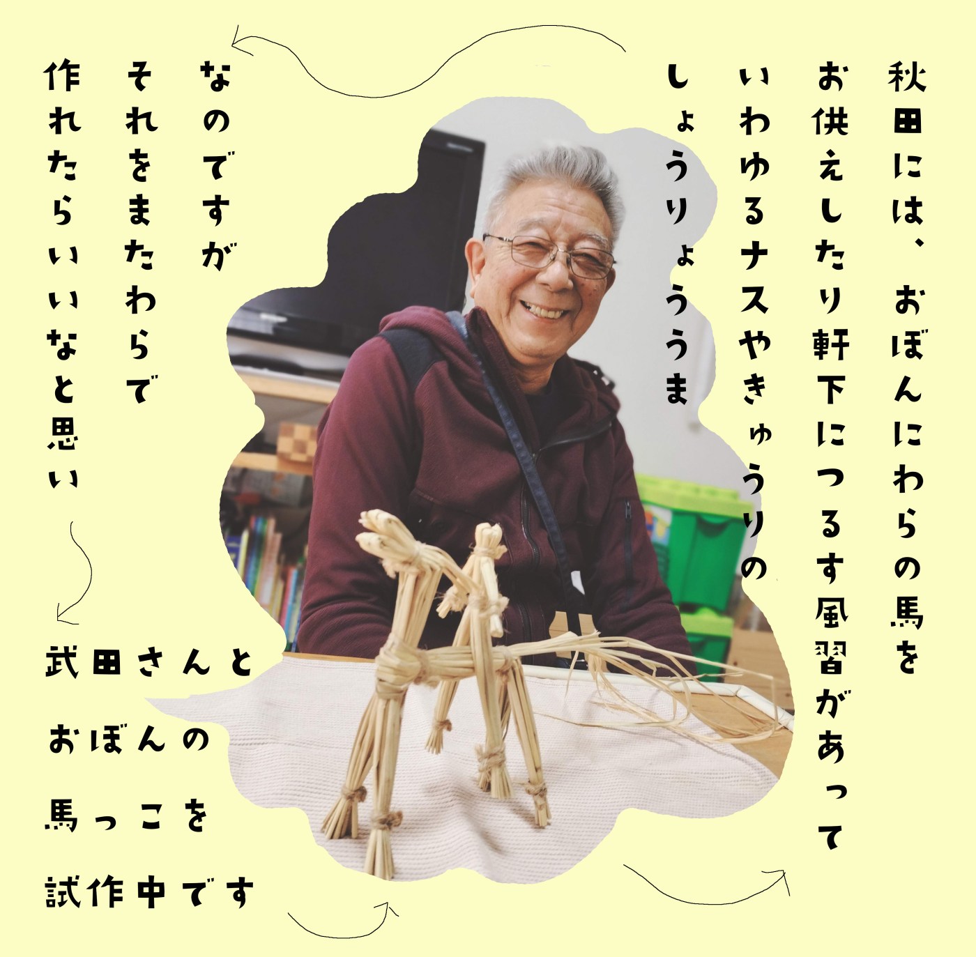 秋田ではこの牛馬を藁で作って供えしたり、軒下に吊るしたりしたといわれています。県南では、牛馬に藁人形を作って乗せる集落もあったとか。