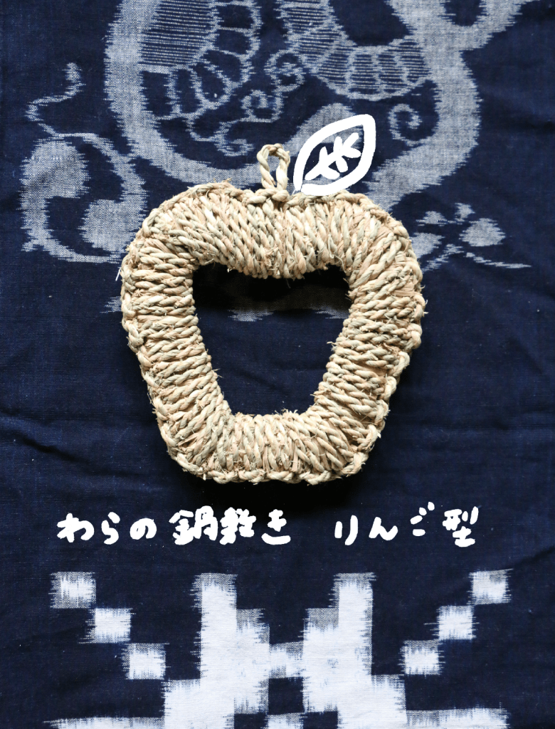 定番の丸いわらの鍋敷きは、安定感があり使いやすいのですが「もうちょっと遊び心が欲しいなぁ」と、思っていたときに、たまたま秋田の古民家でひょうたん型、茄子型、りんご型など、ユニークなわらの鍋敷きに出会い、復刻をわら細工職人の武田謙一さんにお願いしました。