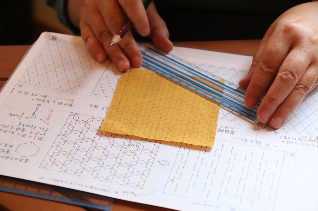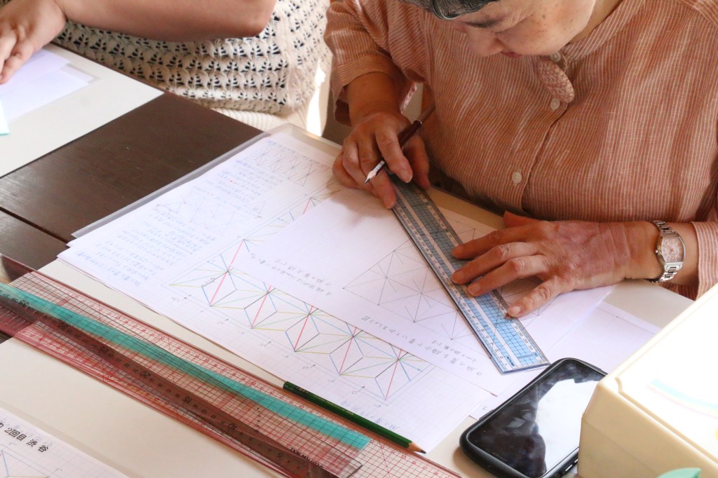 これまでのワークショップでは、小松さんが製作したオリジナルの下図や手引書を元に、「刺す」作業がメインでしたが、こうしていちから図面を書いてみると、いかに刺し子が数学的な構造で成り立っているか、無駄のない設計がなされているかを知ることができます。
