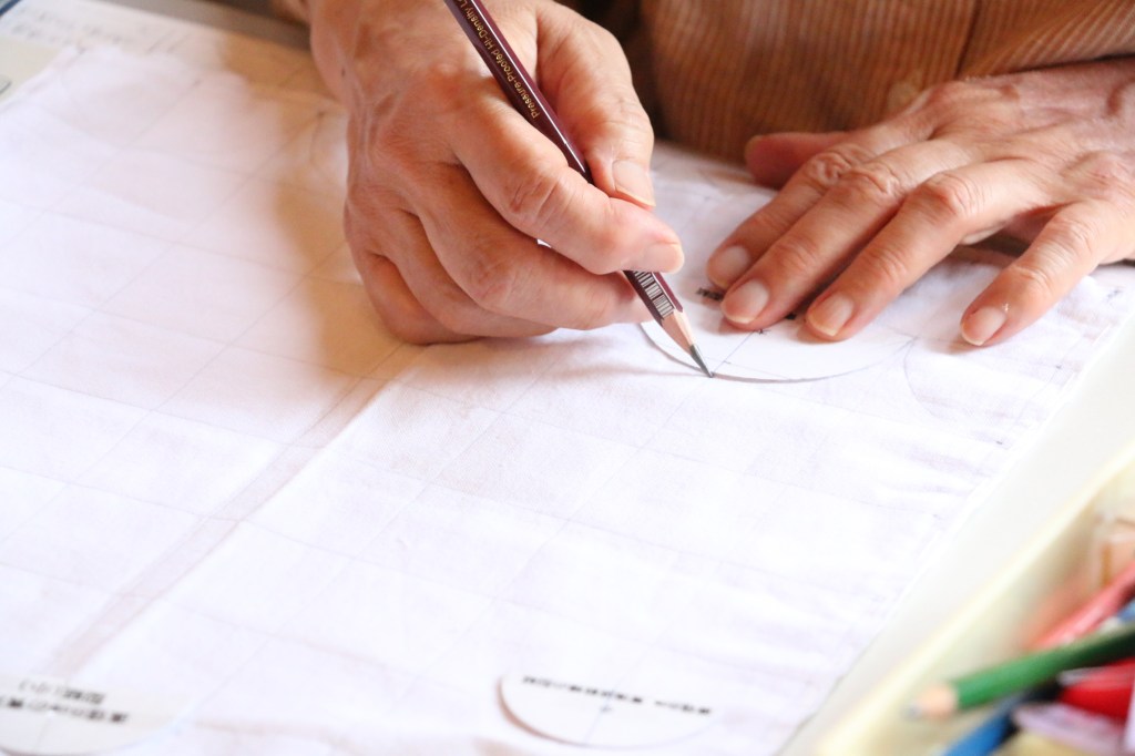 こちらは、伝統模様である青海波を下絵していることろ。小松さんの手作り、半円の型紙をずらしながら、ふきん一面に鉛筆で模様を書いていきます。