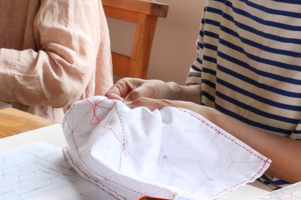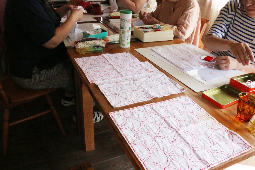 これまでとは違った刺し子の下準備作業は、まさに数学の図形問題を解いているよう。見ているだけで難解な作業でしたが、さすが刺し子ワークショップ・リピーターの方々。「頭が沸騰するー」と言いながらも、しっかり美しい図案を仕上げていました。