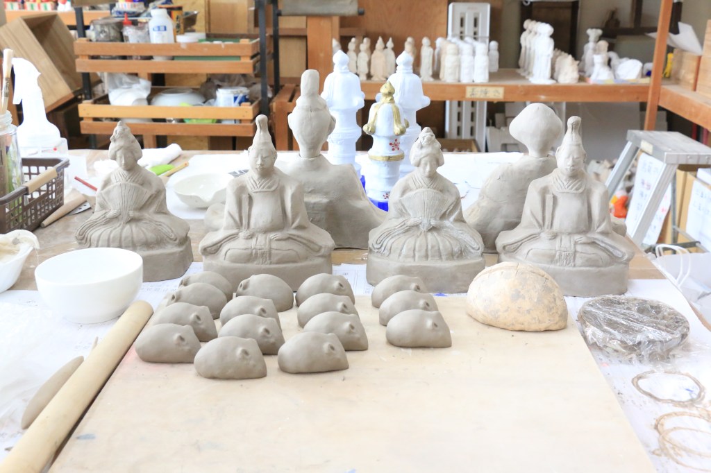 先代の道川トモさんから継いだ人形型の復元は、まるで発掘作業をしているようで、このかたちは扇子じゃないか?この絵付けはどうする?など、迷いながらも弾む声で作業に取り掛かられ、いつもあたたかな眼差しで八橋人形と向き合っておられました。