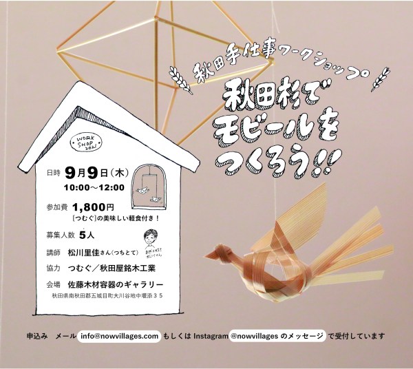 2021年9月9日、秋田手仕事ワークショップ「秋田杉でモビールを作ろう」が無事終了しました。 講師は、... 続きを読む →